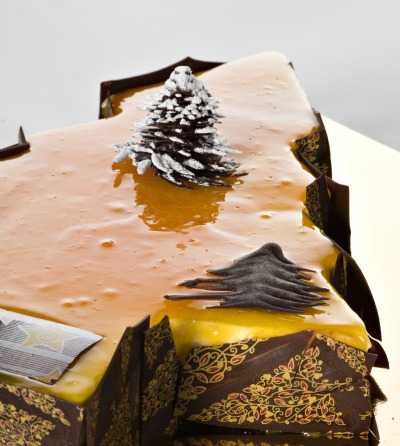 Montaggio e finitura. Con l'ausilio di una fascia da pasticcere a forma di albero di Natale, delle stesse dimensioni di quello usato precedentemente, adagiare sul fondo il pan di Spagna, stendere la mousse e mettere in abbattitore o in freezer per circa 40 minuti. Fare uno strato di crema chantilly all'arancio e rimettere in abbattitore o freezer per 40 minuti circa. Completare con la gelatina colorata con l'arancio, sfilare la fascia e rifinire con placchette di cioccolato.